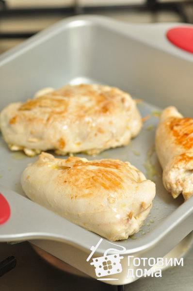 В хорошо разогретое чесночно-перечное масло выложить куриные "кармашки" и обжарить по 2 минуты с каждой стороны до румяной корочки.