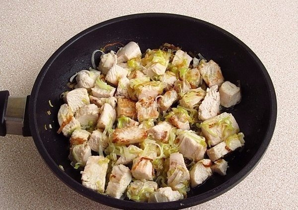 С грудки снять кожу, а филе разрезать на куски, залить холодной водой и отварить до мягкости (около 25 минут). Филе нарезать небольшими кусочками. Рис промывать в нескольких водах до тех пор, пока вода не станет совершенно прозрачной. Белую часть лука-порея разрезать вдоль пополам, а затем каждую половинку нашинковать поперёк тонкими полукольцами. На сковороде разогреть сливочное масло и выложить на него подготовленные лук и филе. Курица и лук порей в сковороде.