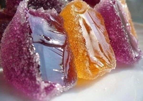 Полученную желейную массу переложить в форму, застеленную пищевой пленкой, и поставить на 6-10 часов в холодильник.По истечении времени застывший мармелад переложить на посыпанную сахаром пергаментную бумагу для выпечки. Нарезать ломтиками и обвалять каждый ломтик в сахаре.