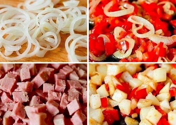 6. Взбить яйца, добавить к ним ветчину.