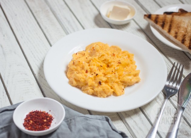 Классические яйца-скрэмбл — это смесь собственно яиц с небольшим количеством воды, молока или сливок. Но в нашем рецепте есть небольшой секрет в виде порции крахмала, которая делает консистенцию готового блюда более нежной и кремообразной.