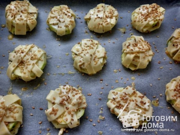 Каждую кабачково-сырную пирамидку обматать полоской теста как клубочек и положить на противень.