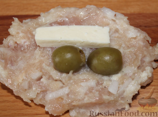 Из фарша сделать лепешку, положить две оливки и кусок сыра.