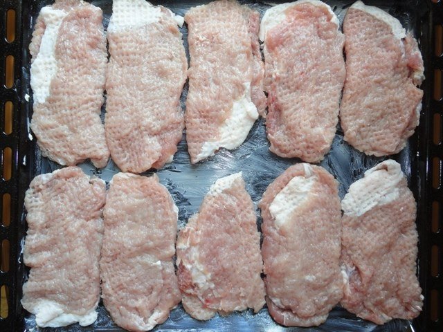 Потом каждый кусочек отбить с двух сторон. Старайтесь не прорвать мясо до дыр.
