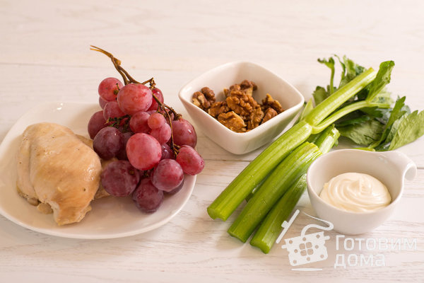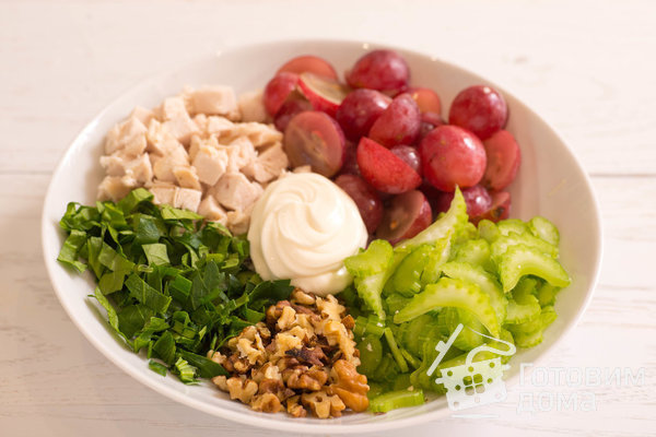 Все ингредиенты соединить в миске (немного орехов можно отложить для украшения) , заправить майонезом или йогуртом, подсолить, поперчить, по вкусу и перемешать.