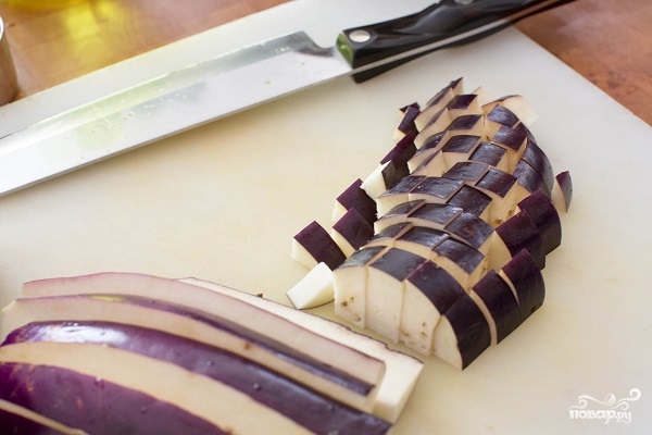 2. Вымойте и обсушите баклажаны. Нарежьте их средними кубиками и выложите в глубокую мисочку. Подсолите и отставьте на время в сторону.