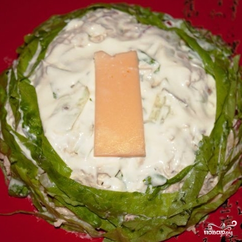 Кусок сыра кладем в центр салата, по периметру выкладываем листья салата.