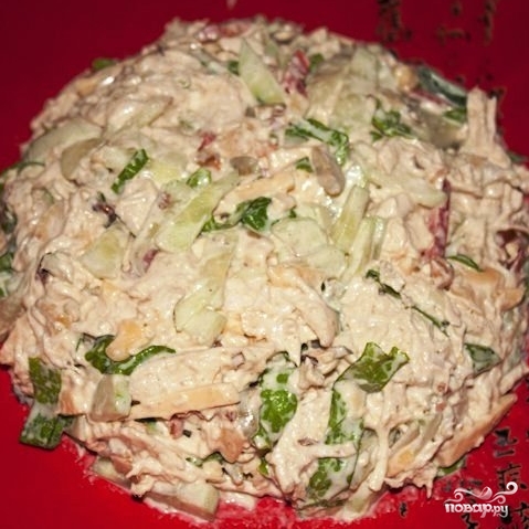 Сперва необходимо отварить до готовности куриное филе, остудить его и разобрать на волокна.