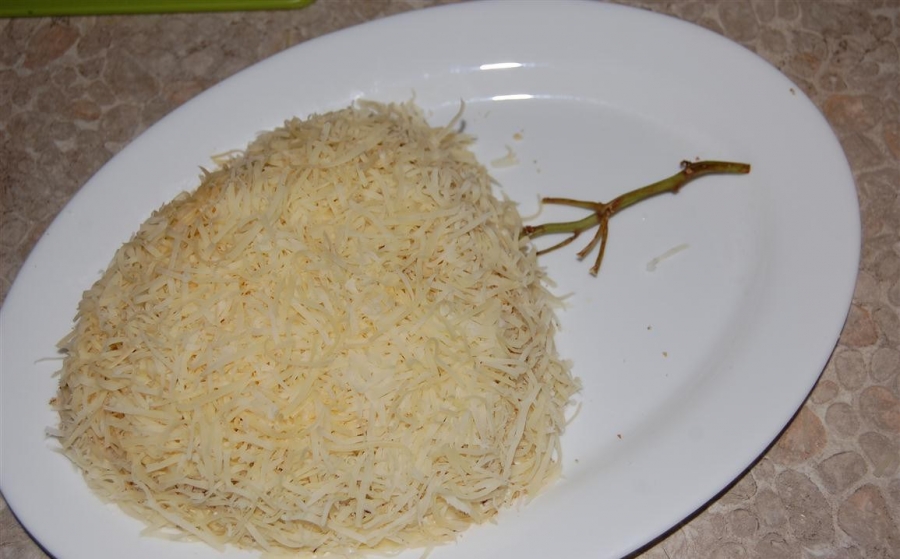 Сверху трем яйца на крупной терке.