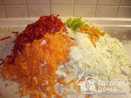 Нашинковать капусту тонко,морковь натереть на тёрке, мелко нарезать сельдерей,нарезать брусочками лук и болгарский перец ,посолить.