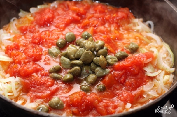 6. С помидоров снимите кожицу (можно также использовать готовый томат), выложите их к луку. Добавьте каперсы, затем все аккуратно перемешайте и тушите на среднем огне 3-5 минут.