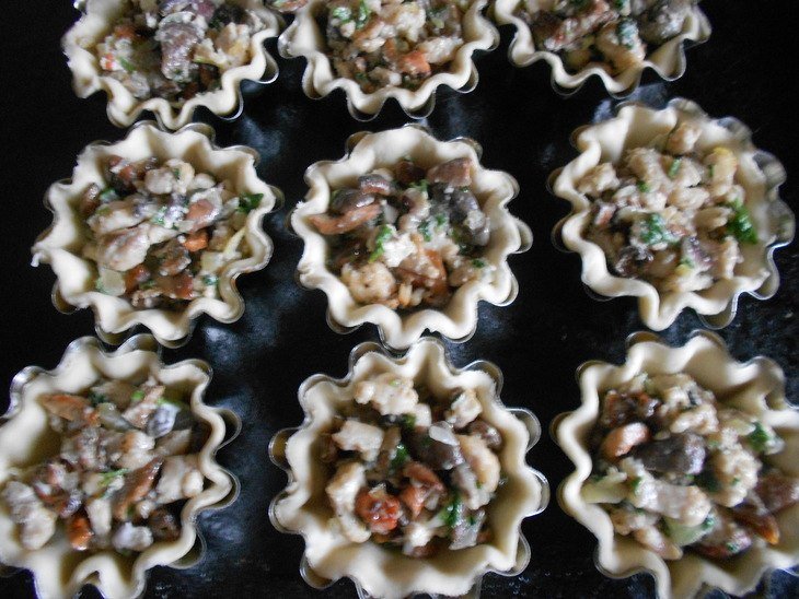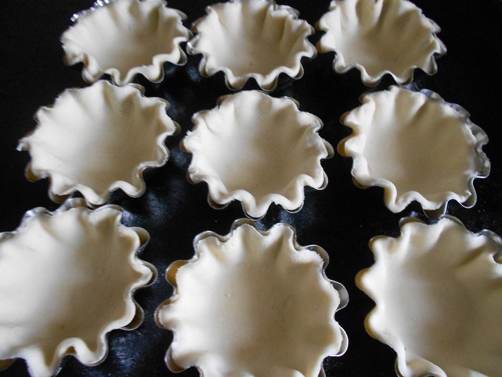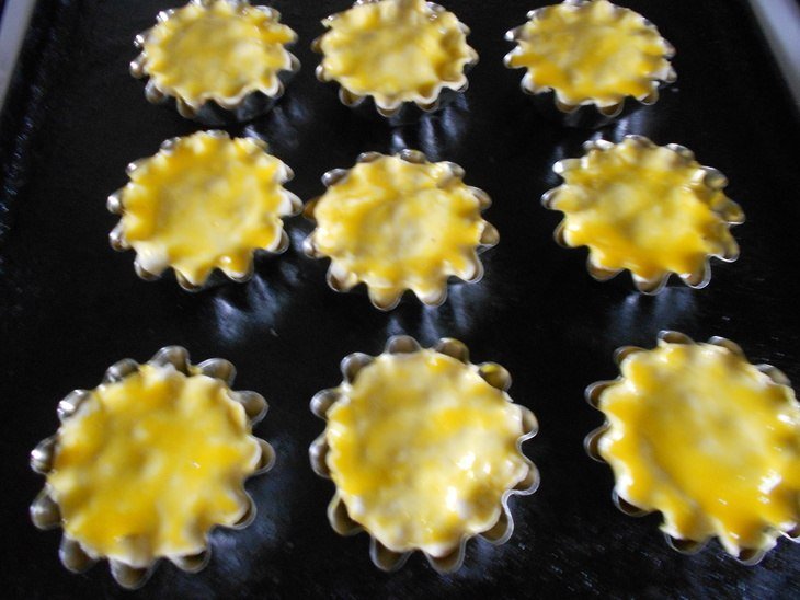 7.Накрыть формочки маленькими кружками, края теста плотно защипать. Желток взбить и смазать поверхность мини-тортов.