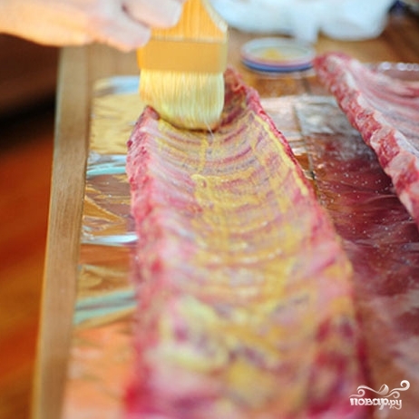 Каждую плитку ребер хорошенько смазываем горчичной массой с обеих сторон.