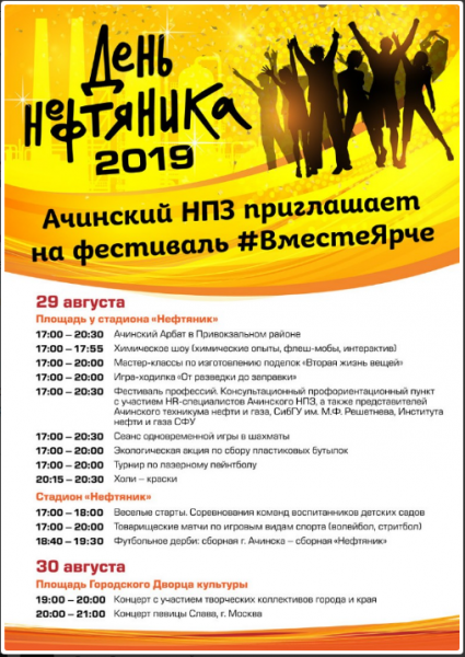 #ВместеЯрче! День нефтяника-2019 в Ачинске: химическое шоу, парад профессий, открытие обновленной площади стадиона «Нефтяник», концерт столичной звезды - певицы Славы и многое другое