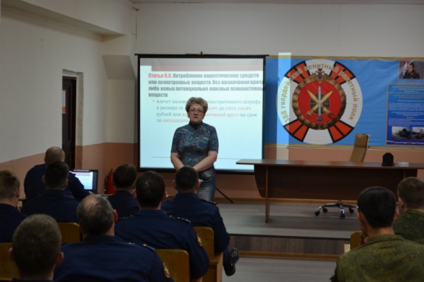 В ходе профилактической беседы полицейские рассказали, что все больше молодых людей задерживают по подозрению в совершении преступлений в сфере незаконного оборота наркотиков. Военнослужащим контрактной и срочной службы разъяснили ответственность за данные правонарушения и преступления.