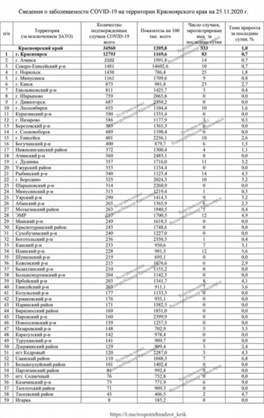 25 ноября в Красноярском крае выявили на 3 случая коронавирусной инфекции меньше, чем днем ранее — 333 человека заболели. Общее число заразившихся новым вирусом в регионе составляет 34 560. В числе новых заразившихся 83 красноярца (на 5 меньше, чем во вторник).