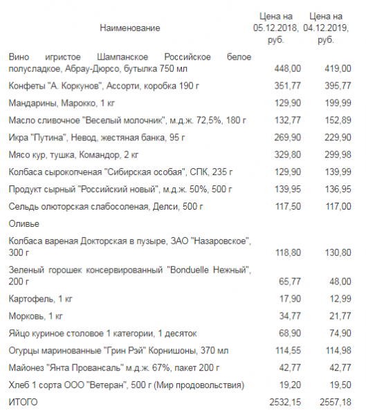 «В этом году наибольшее снижение цен отмечено на красную икру, баночка 100-граммового лососёвого деликатеса подешевела на 40 рублей (14,8%). Также понизились цены на мясо кур на 29 рублей (9%) и шампанское на 29 рублей (6,4%). Подросла стоимость мандарин. На остальные продукты цены остались стабильными или изменились незначительно», — доложила об экономических наблюдениях А.Фенцель.