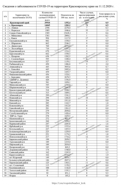 В Красноярском крае выявили новые случаи заражения коронавирусом. Всего за сутки подтвердили диагноз у 446 человек. Мы находимся на 12-м месте в стране по темпам заболеваемости. По данным Роспотребнадзора, сегодня коронавирус подтвердился у 337 человек, еще 109 заразились коронавирусом в Железногорске, по Зеленогорску данных пока не опубликовали. За всё время пандемии в Красноярском крае вместе с ЗАТО выявлено 47 768 случаев.