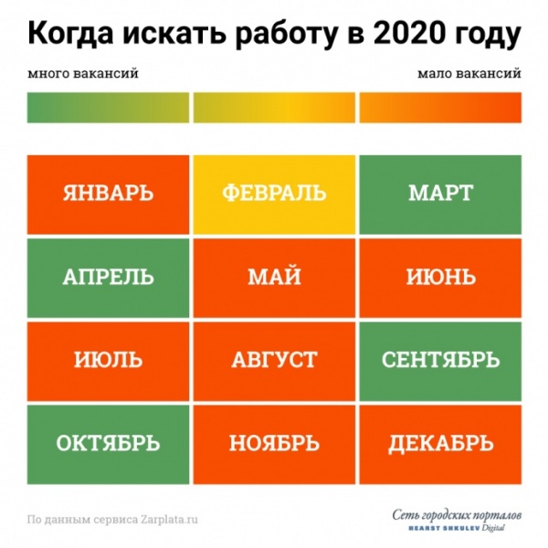 Тем, кто решил отложить поиск работы на «после майских», придется непросто — их ждет долгий период затишья на рынке. Чтобы упростить вам поиски, мы вместе с HR-специалистами создали специальный календарик, в котором самые выгодные месяцы для смены работы выделены зеленым, а неудобные — оранжевым. Используйте его как шпаргалку.