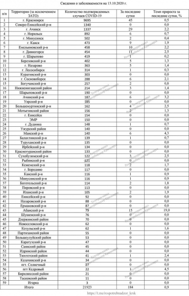 ЗАТО Железногорск и ЗАТО Зеленогорск не входят в общую статистику. На официальном сайте администрации Железногорска указаны 18 новых заболевших за сутки, хотя вчера был всего один. Лидером по новым случаем остается Красноярск — +45, Ачинск также догоняет краевой центр, там +29 случаев за сутки.