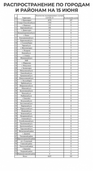 За последние сутки выявлено 161 новых заболевших в 54 районах края. Таким образом, общее число в регионе выросло до 6655 человек от начала пандемии.