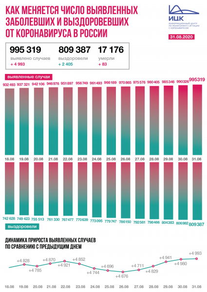 Всего на сегодняшний день зарегистрировано 995 319 случаев (+0,5%) коронавирусной инфекции в 85 регионах. За весь период зафиксировано 17 176 летальных исходов, выздоровели 809 387.