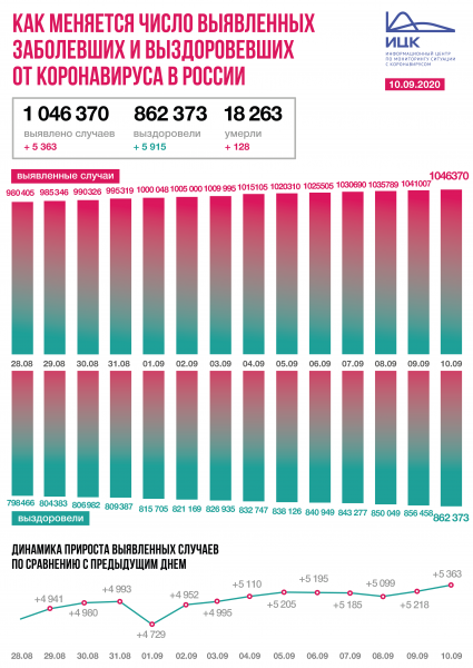 Всего на сегодняшний день зарегистрировано 1 046 370 случаев (+0,5%) коронавирусной инфекции в 85 регионах. За весь период зафиксировано 18 263 летальных исхода, выздоровели 862 373.