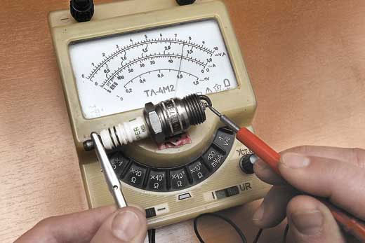 Данный способ подразумевает проведение проверки с использованием тестера, позволяющего определить параметр электросопротивления свечи. Проверка проводится следующим образом – к электроду и наконечнику свечи необходимо подсоединить клеммы, идущие от прибора и включить его.