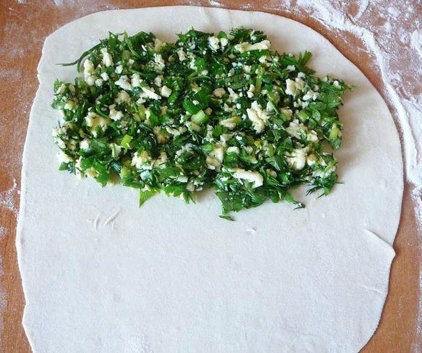 -Тесто разделить на небольшие кусочки. Раскатать очень тонкую лепешку.
