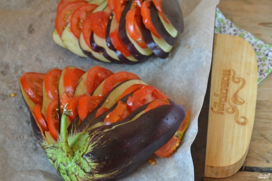 3. Помидоры порежьте тонкими кружочками и положите между пластинами баклажана.