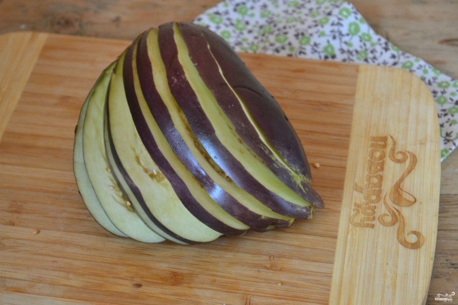 2. Баклажаны порежьте тонкими пластинами, не дорезая до конца 1 см, должен получиться веер.