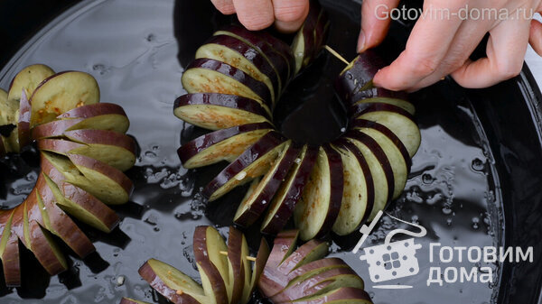 Делаем поперечные надрезы, не доходя до конца, ограничители помогут нам в этом.Затем переворачиваем баклажан надрезами вниз, также фиксируем при помощи ограничителей и делаем надрезы под углом 45 градусов. Чем меньше в диаметре ваши баклажаны, тем толще берите ограничители, чтобы не прорезать баклажаны насквозь. Лучше остановитесь в процессе и проверьте, все ли у вас получается. На самом деле, делается такая спиралька очень просто, нужно просто понять принцип.Посмотрите, какая красивая спираль у нас получилась!