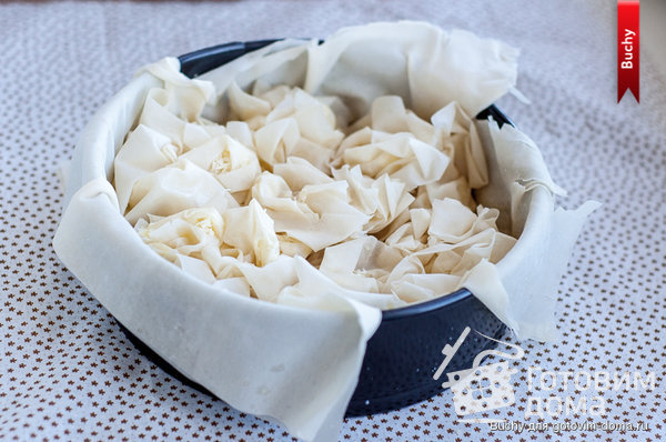 Выложите в форму 2 листа теста так, чтобы концы листа свисали, смажьте маслом.