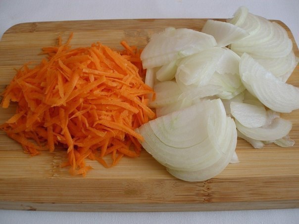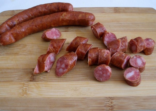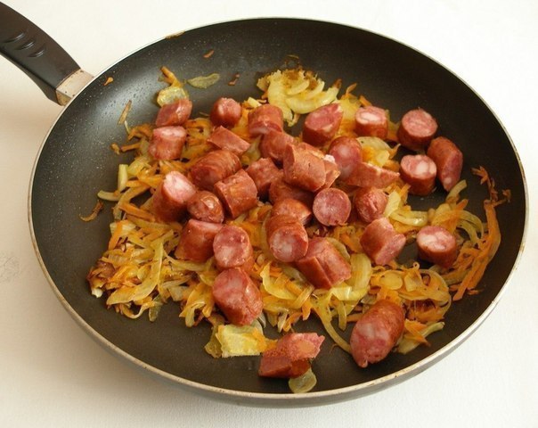 На растительном масле обжарить лук и морковь до золотистого цвета, добавить колбаски, соль и специи, обжарить все вместе несколько минут.