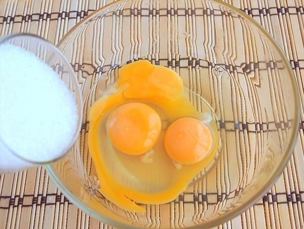 2. Вылейте яйца (предварительно промыв их под водой) в большую емкость, добавьте к ним сахарный песок и начинайте быстро перетирать их до получения светлой пышной массы.
