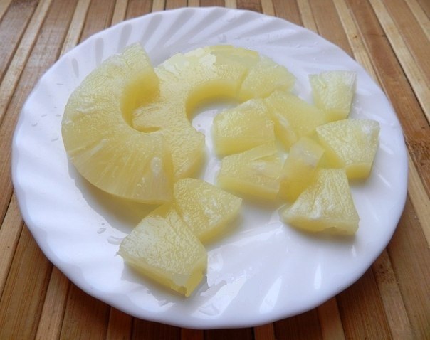 Колечки ананаса (в нашем случае ягоды) нарезать кусочками.