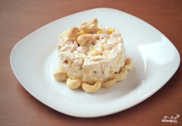 4. Перемешаем все вместе, заправим сметаной, солим, выкладываем горочкой, украсив сверху орешками.