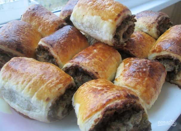 Раскатайте пласт слоеного теста, нарежьте прямоугольниками (примерно 5*10). Выложите немного начинки и сверните рулетом.
