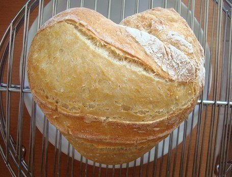 Посыпать поверхность мукой, выложить тесто помять его, придать форму либо классическую как на фото, либо придать форму сердца, острым ножом сделать надрезы, но не глубокие, выложить на противень и поставить в духовку выпекаться на 40-50 минут. До золотистой корочки. Выложить готовый хлеб на решетку накрыть полотенцем, чтобы корочка не была сухой, но если Вам нравятся сильно хрустящий хлеб, то полотенцем не накрывать.