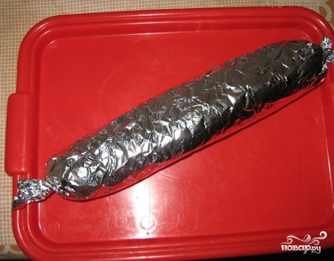 На мелкой терке натираем свеклу, добавляем к ней ложку воды, перемешиваем. Отжимаем из свеклы сок, добавляем его к фаршу и еще раз перемешиваем. Расстилаем фольгу, смазываем ее маслом, кладем фарш, формируем из него колбаску, плотно заворачиваем её в фольгу, чтобы не было пустого места, по бокам скручиваем.