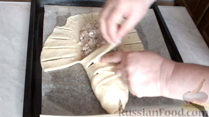 Выложить пласт теста на противень, покрытый пергаментной бумагой, смазанной маслом. Выложить на середину теста начинку.