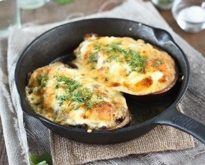 5. В "лодочки" слоями выложить: фарш, баклажаны, грибы. Сверху посыпать тертым чесноком. Запекать при 200 С около 10 минут. Залить баклажаны сметаной, присыпать тертым сыром и мелко порубленной зеленью. Запекать при 200 С еще 10 минут.