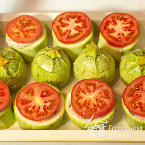 Сверху, на каждый кабачок кладем кружок помидора.