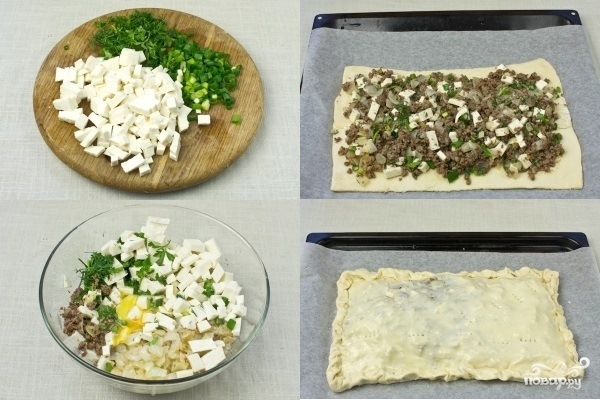 2. Брынзу нарежьте мелкими кубиками. Зелень мелко порубите. К фаршу добавьте жареный лук, нарубленную зелень и брынзу, вбейте яйца, поперчите и посолите по вкусу. Хорошо перемешайте. На противень положите пекарскую бумагу. Половину готового слоеного теста раскатайте и переложите на бумагу, выложите на него начинку. Сверху накройте второй частью теста, также раскатанной в тонкий пласт. Накройте пирог листом из теста. Поверхность смажьте оливковым маслом и проколите в нескольких местах, например — вилкой.