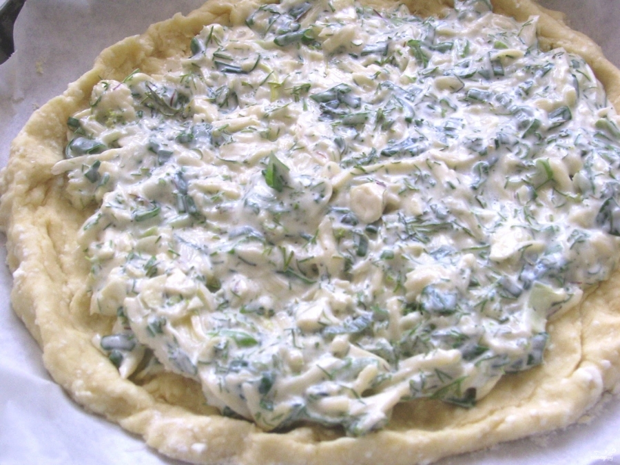Застелите противень пергаментом. Половину теста раскатайте в лепешку, сформируйте бортики, выложите равномерным слоем начинку. Из второй половины теста сделайте аналогичную лепешку.