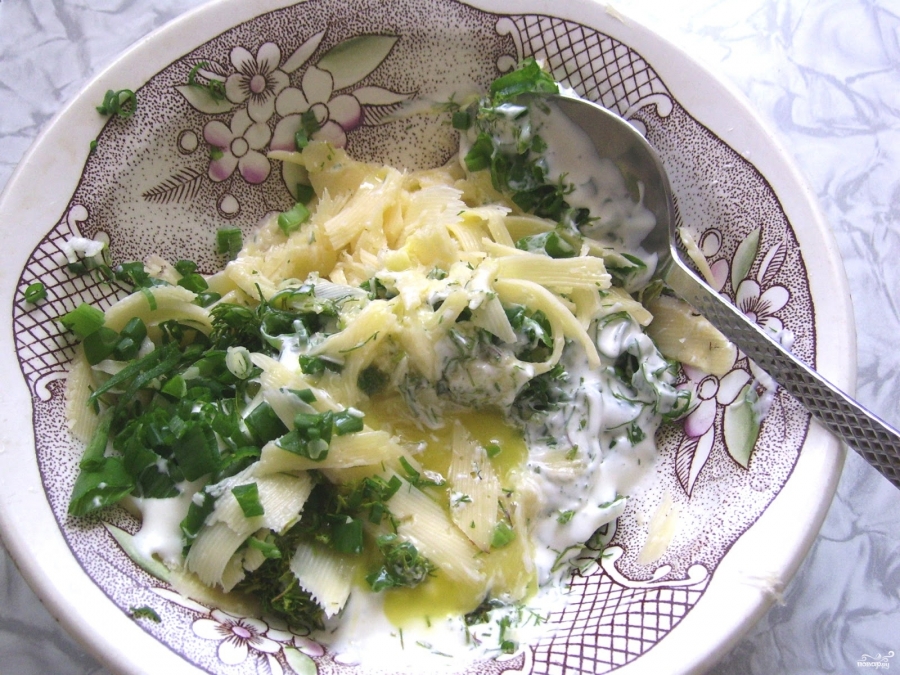 Приготовьте начинку: натрите на терке сыр (можно крупно). Добавьте яйцо, майонез, измельченный чеснок, также можете добавить зелень по вкусу. Перемешайте.