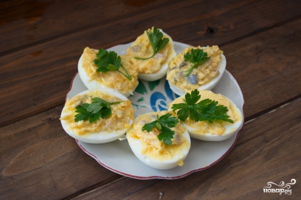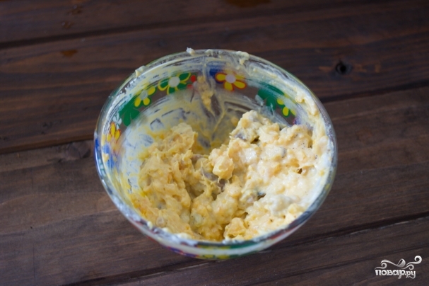 3.Получим вот такую массу. Этой массой наполните каждую половинку яйца.