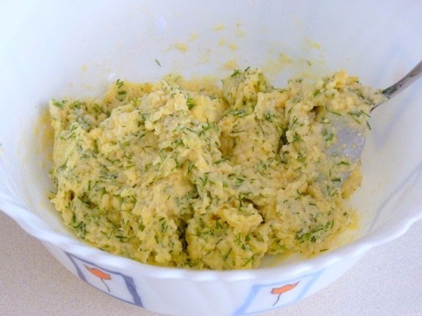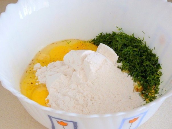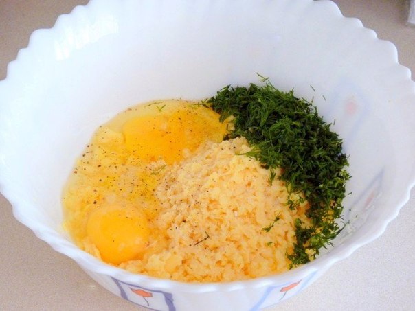 1. Сыр натереть на крупной терке, добавить яйца и нарезанный укроп.