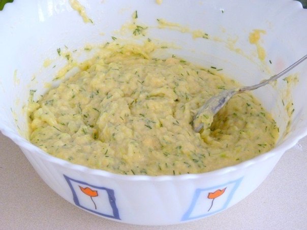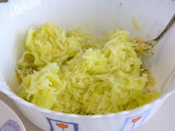 4. Кабачки очистить от кожуры и натереть на крупной терке. Чуть присолить и оставить минут на 7—10, чтобы кабачки пустили сок. Затем отжать кабачки от сока и добавить в полученное тесто.
