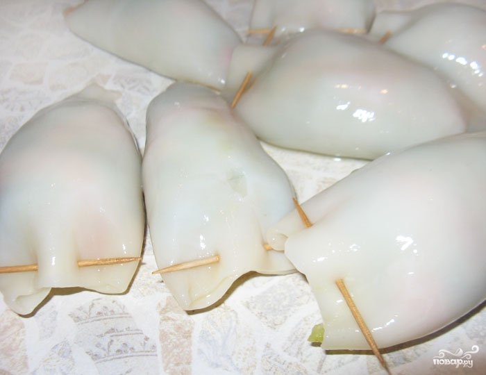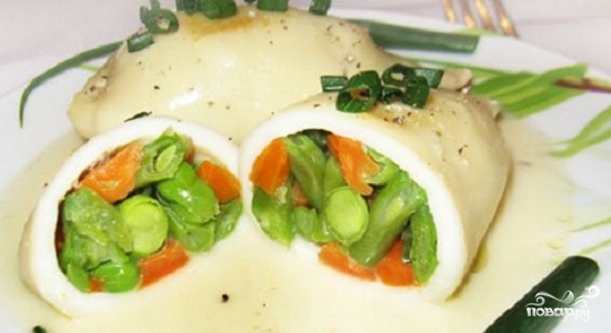 3. Очищенные и промытые тушки кальмаров наполните овощной смесью.